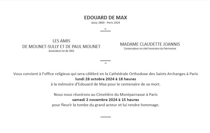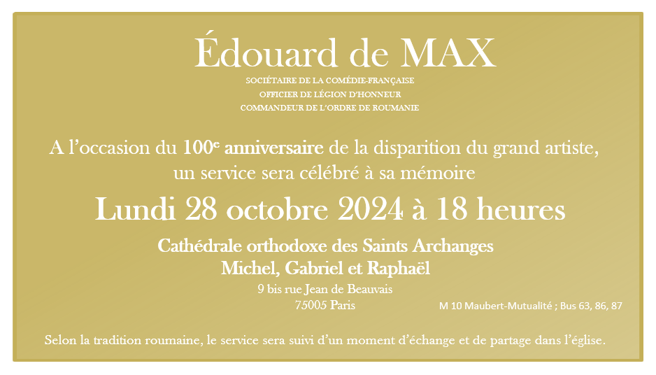 Le 28 octobre prochain à 17 heures, cela fera 100 ans que s’éteignait à Paris le grand acteur roumain sociétaire de la Comédie-Française Edouard de Max né le 27 février 1869 à Jassy (Iași) en Roumanie.
