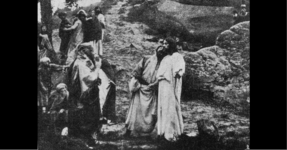 « Le Baiser de Judas » : Le pauvre homme s’avance vers Judas et lui tend sa bourse. – Judas (M. Mounet-Sully), Jésus (M. Albert Lambert) – Le Film d’Art – PATHE 1908